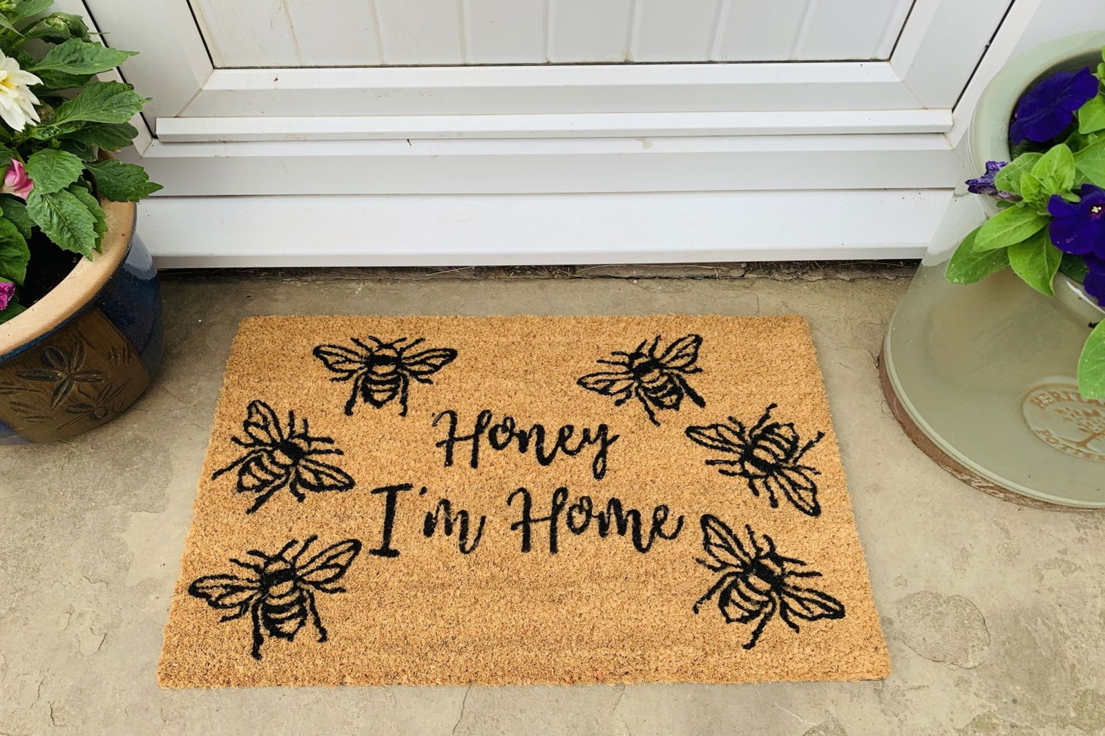 This coir doormat with "Honey I'm Home" written amongst bees would be a perfect gift for a new home to add love and a homely feel at the entrance with a touch of comedy. Coir mat with black writing "Honey I'm Home" and Bee picture.
