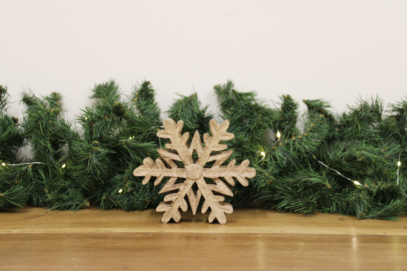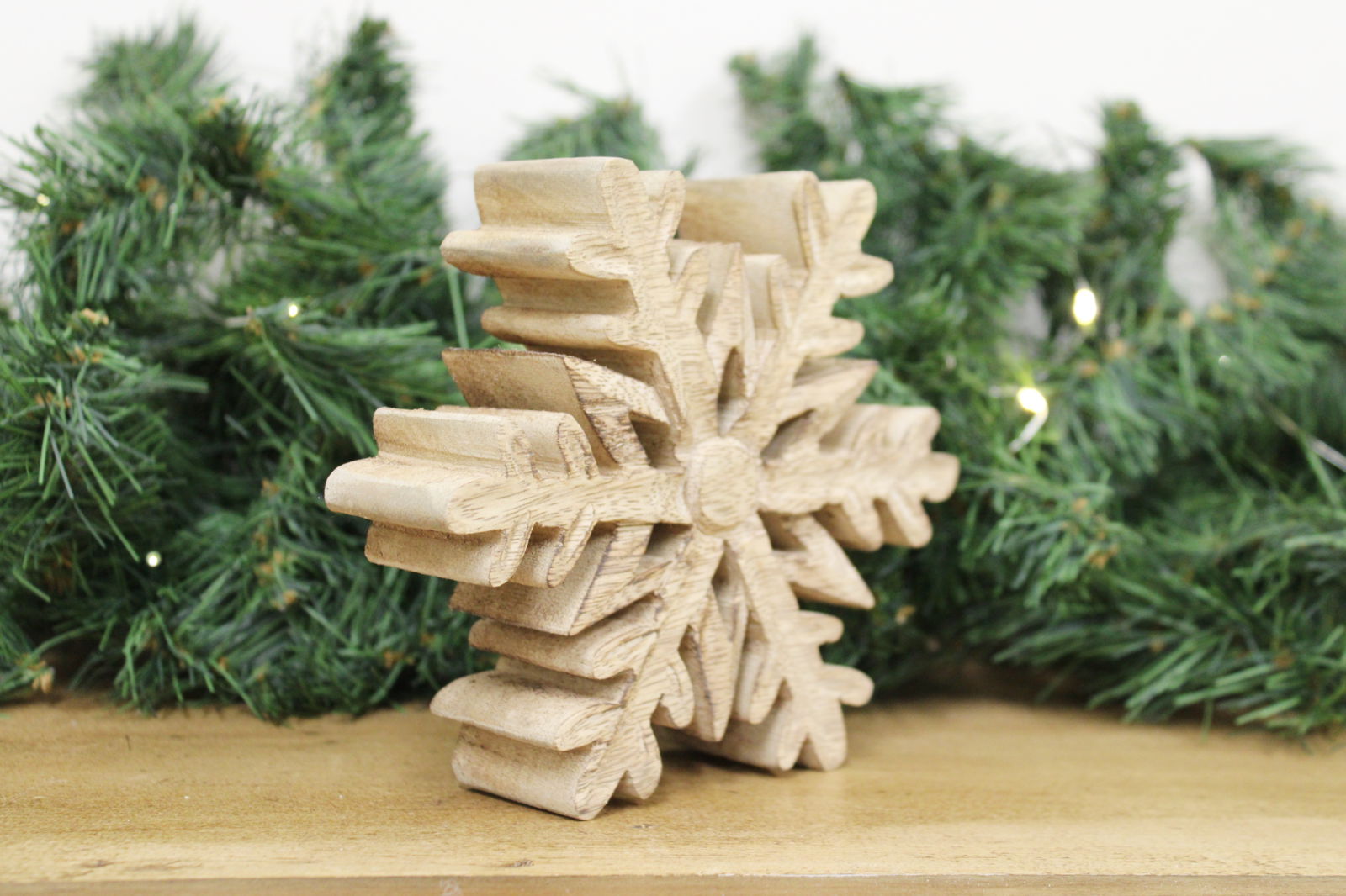 Free-standing cut-out snowflake decoration. Made from Mango Wood with a natural wood finish.
